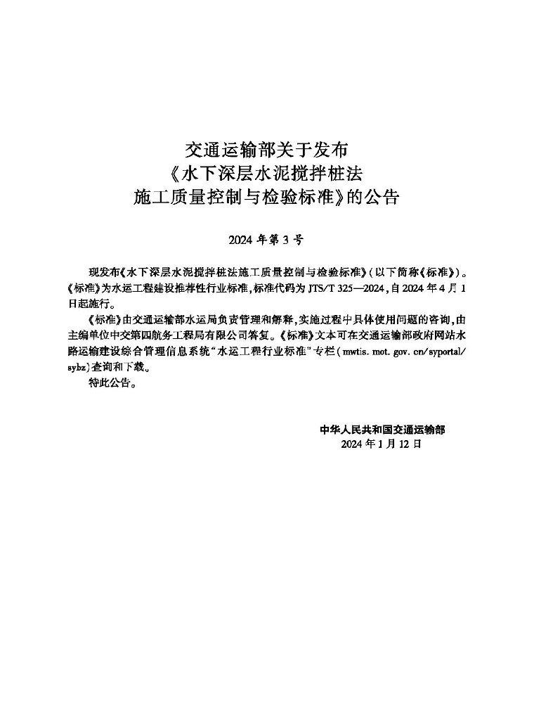 JTS/T 325-2024 水下深层水泥搅拌桩法施工质量控制与检验标准