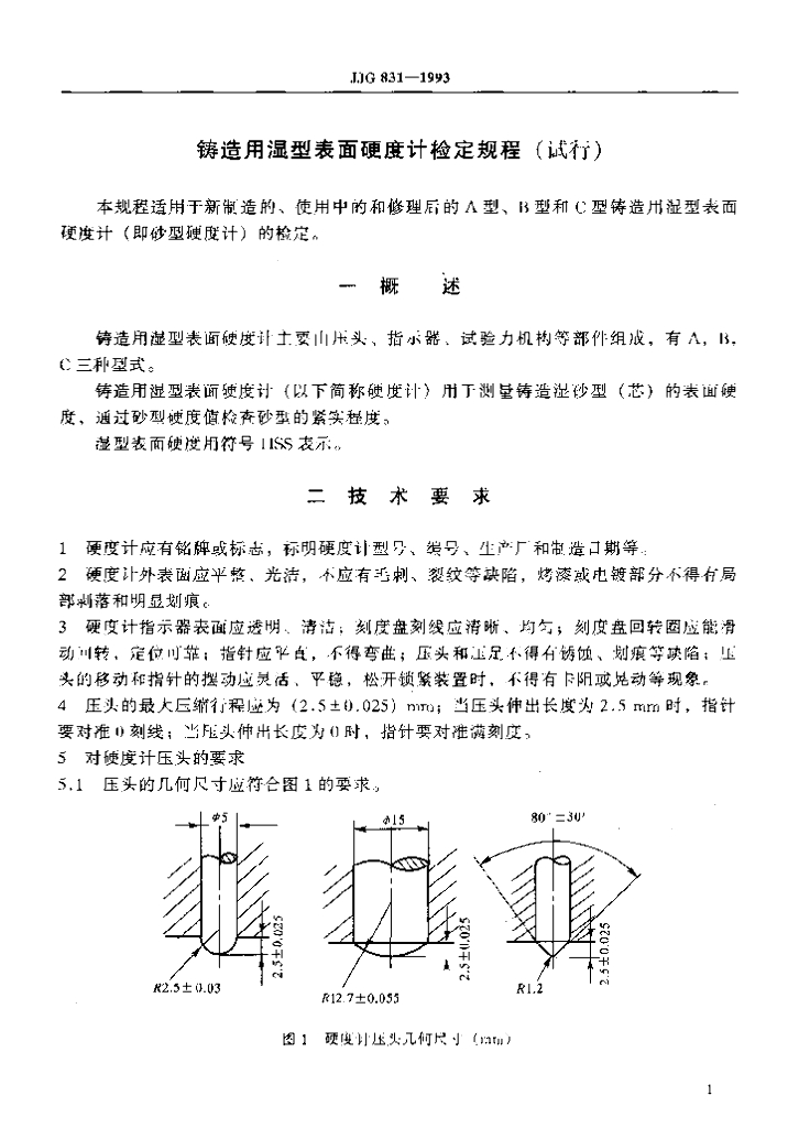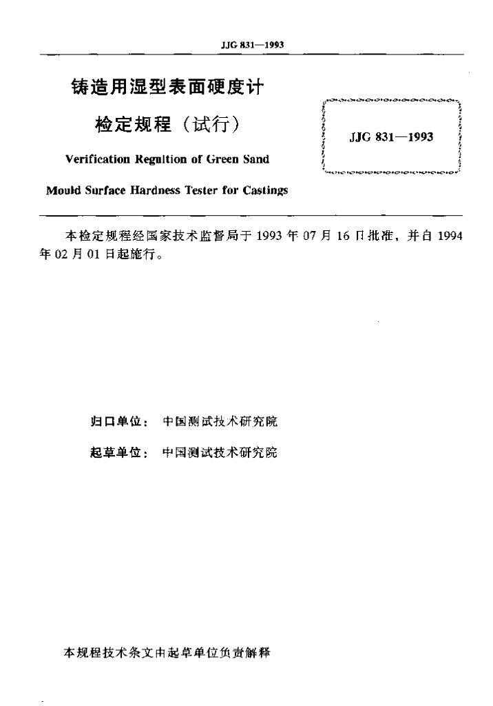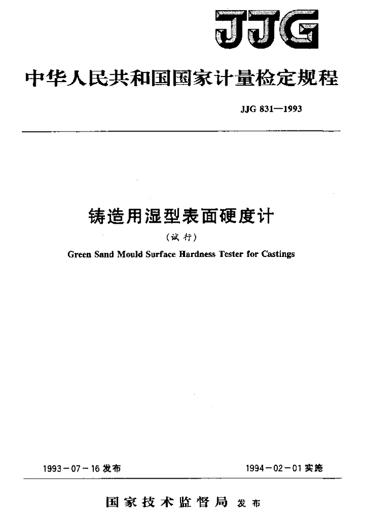 JJG 831-1993 铸造用湿型表面硬度计检定规程(试行)