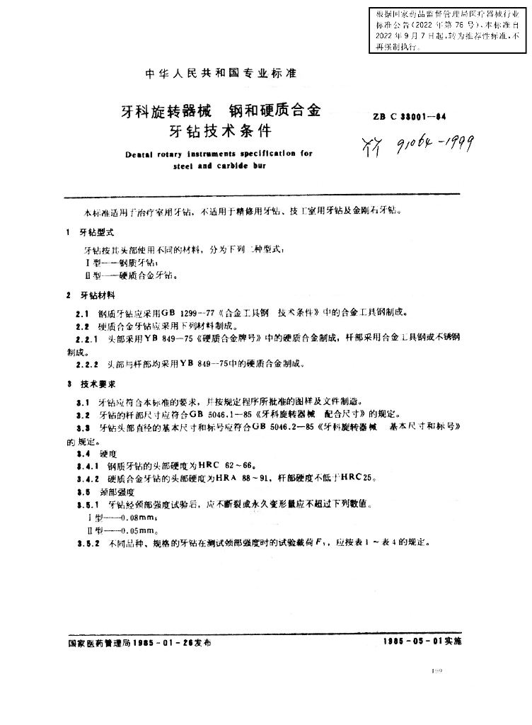 YY/T 91064-1999 牙科旋转器械 钢和硬质合金牙钻技术条件