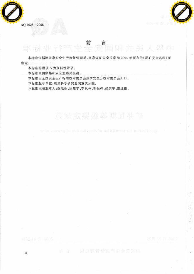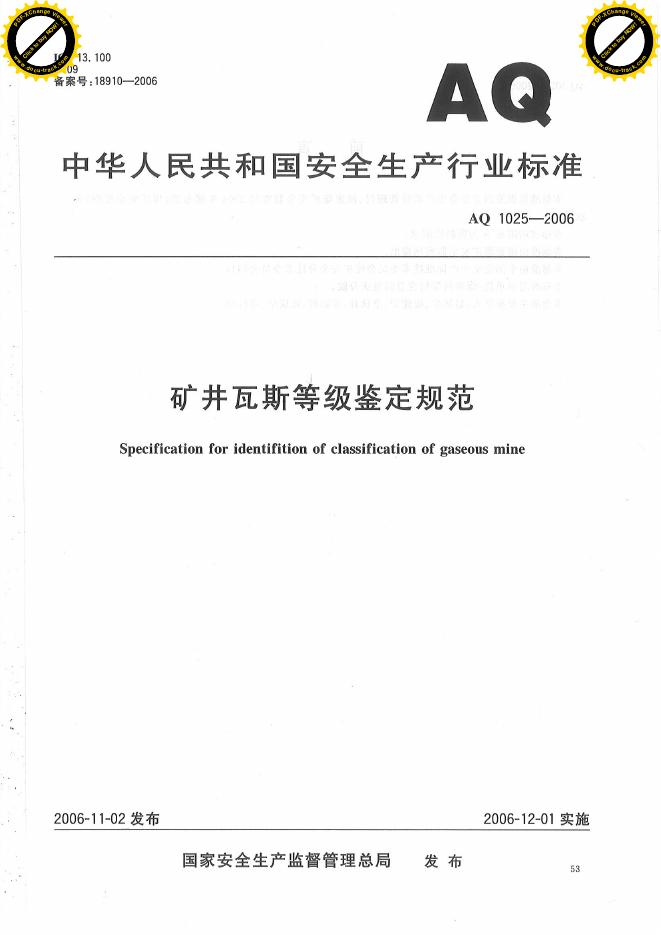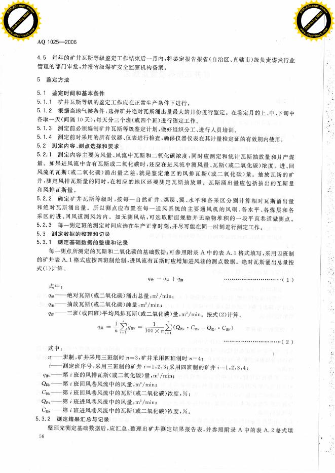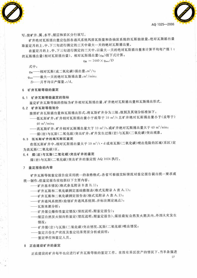 AQ 1025-2006 矿井瓦斯等级鉴定规范