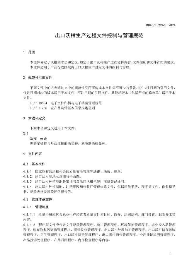 DB45/T 2946-2024 出口沃柑生产过程文件控制与管理规范