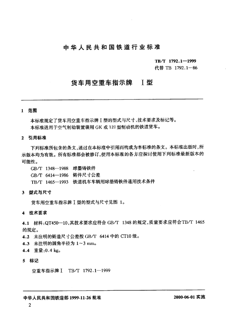 TB/T 1792.1-1999 货车用空重车指示牌I型