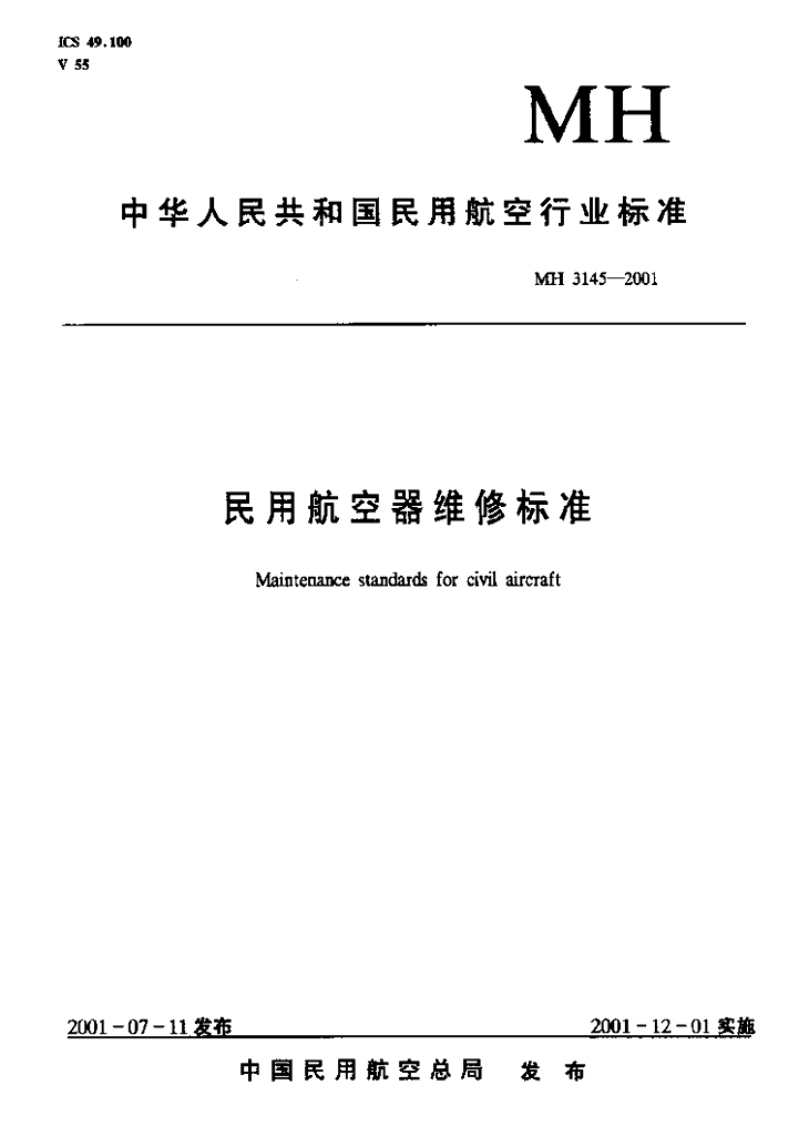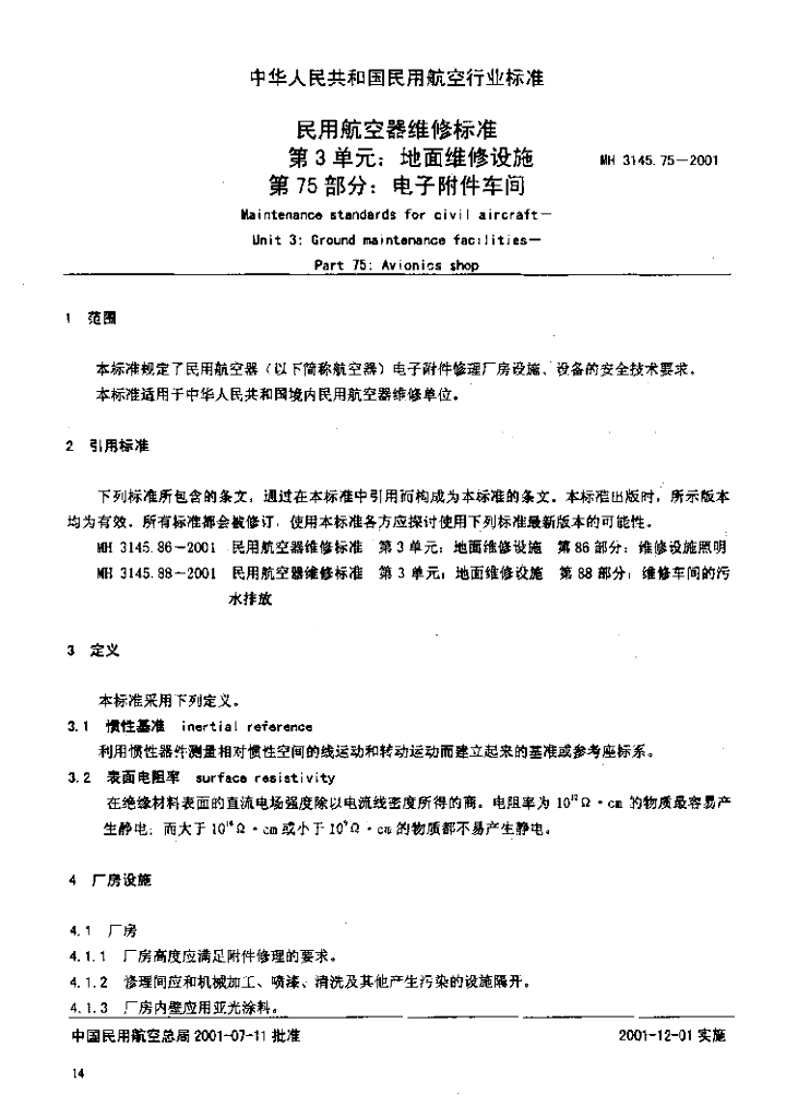 MH 3145.75-2001 民用航空器维修标准 第3单元 地面维修设施 第75部分 电子附件车间