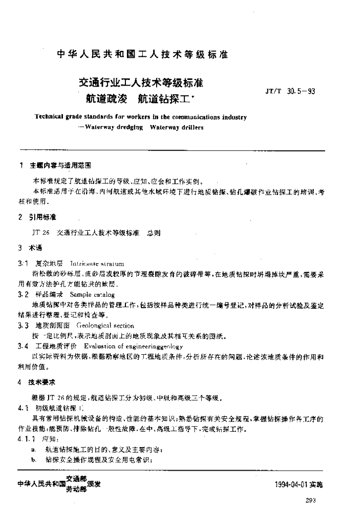 JT/T 30.5-1993 交通行业工人技术等级标准航道疏浚航道钻探工