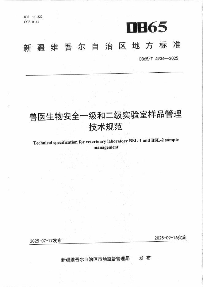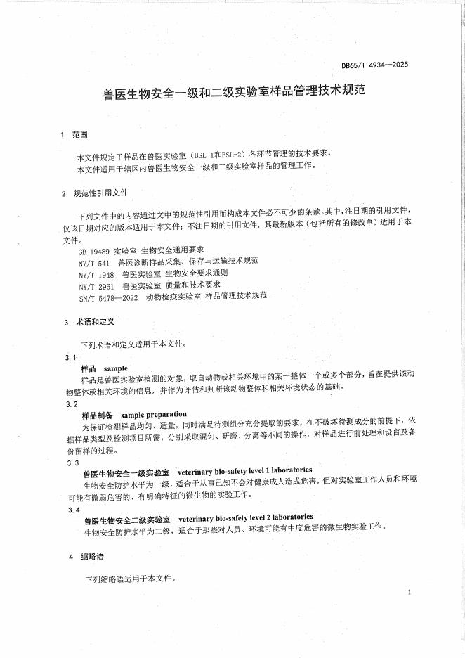 DB65/T 4934-2025 兽医生物安全一级和二级实验室样品管理技术规范
