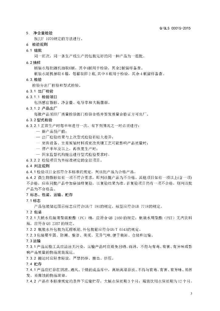 Q/GLS 0001S-2015 济南市历城区甘露思天然泉水厂 桶(瓶)装饮用水