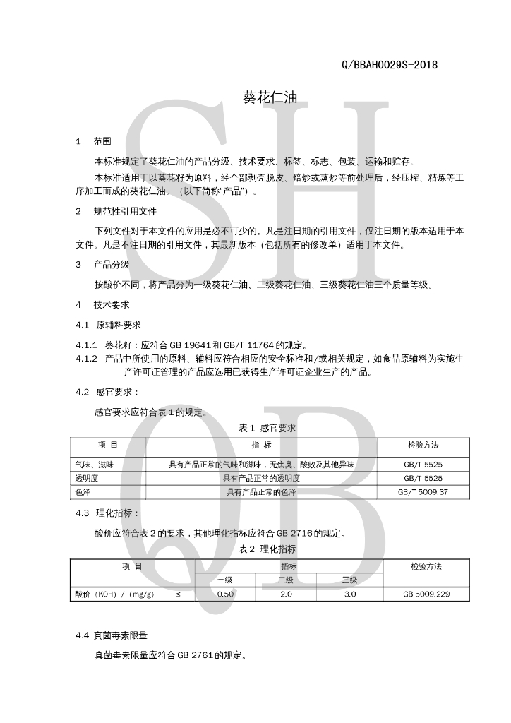 Q/BBAH 0029S-2018 葵花仁油