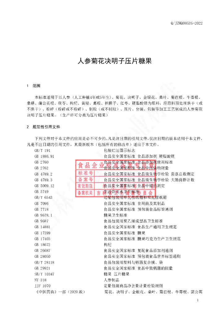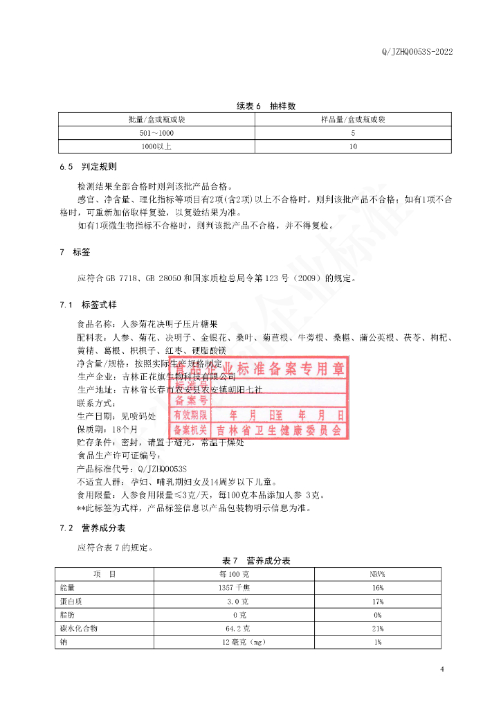 Q/JZHQ 0053S-2022 人参菊花决明子压片糖果