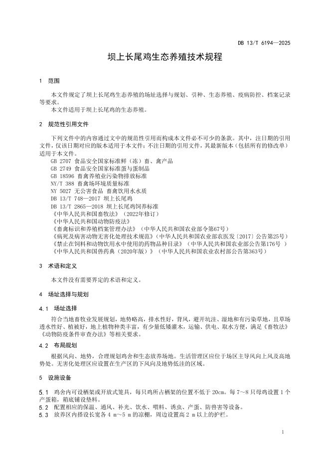 DB13/T 6194-2025 坝上长尾鸡生态养殖技术规程