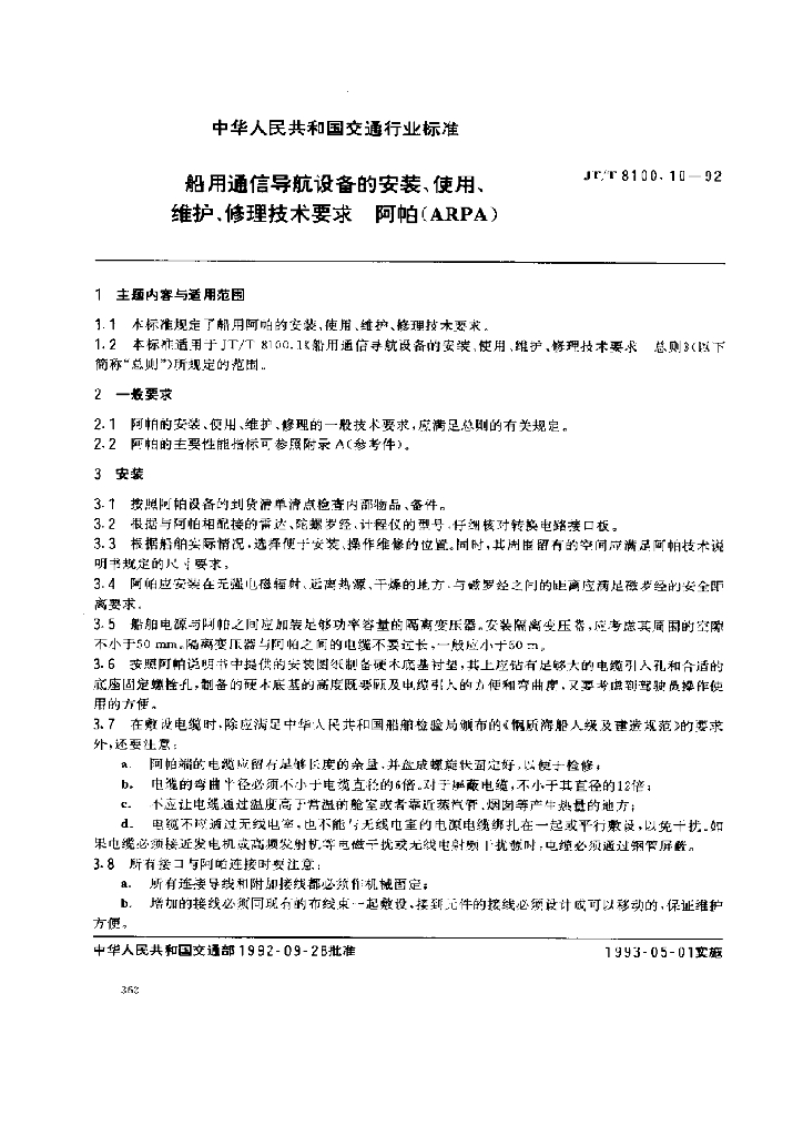JT/T 8100.10-1992 船用通信导航设备的安装、使用、维护、修理技术要求阿帕(ARPA)