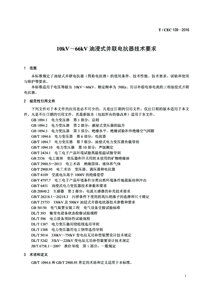 T/CEC 109-2016 10kV~66kV油浸式并联电抗器技术要求