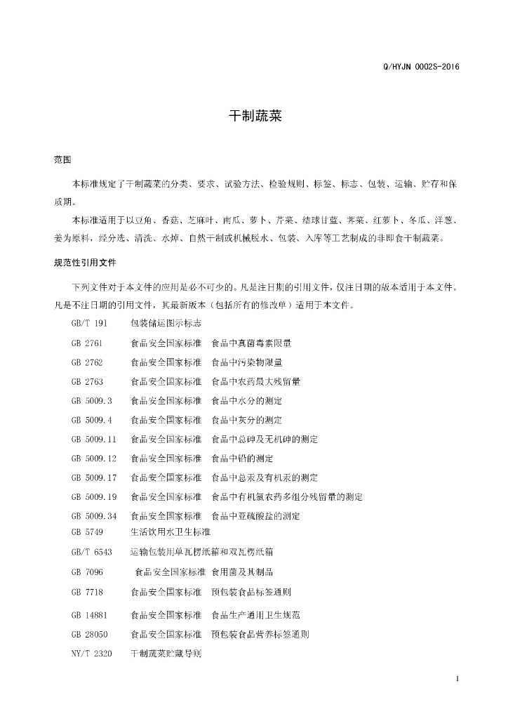Q/HYJN 0002S-2016 淮阳县金农实业有限公司 干制蔬菜