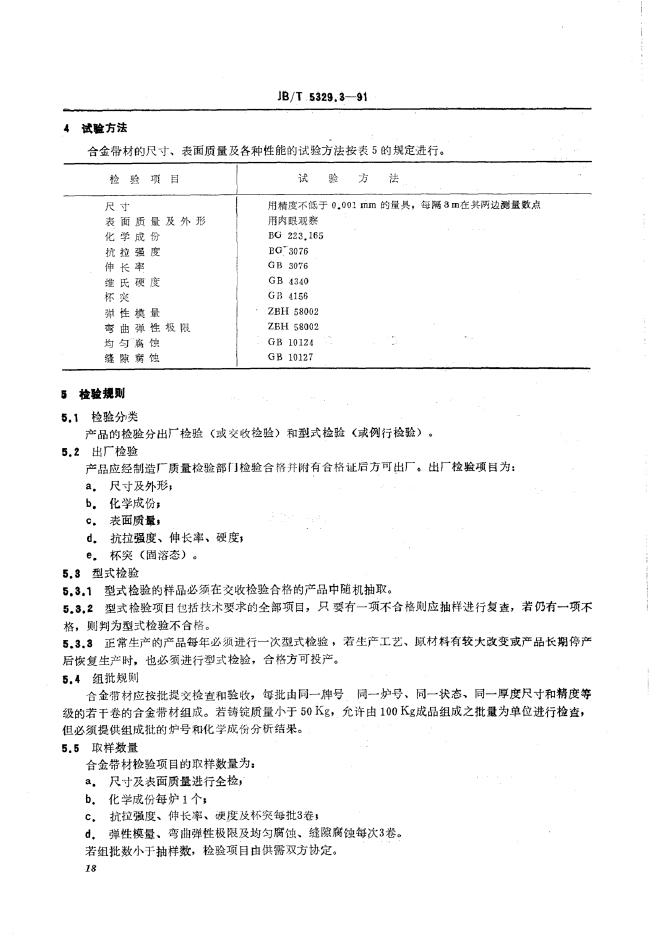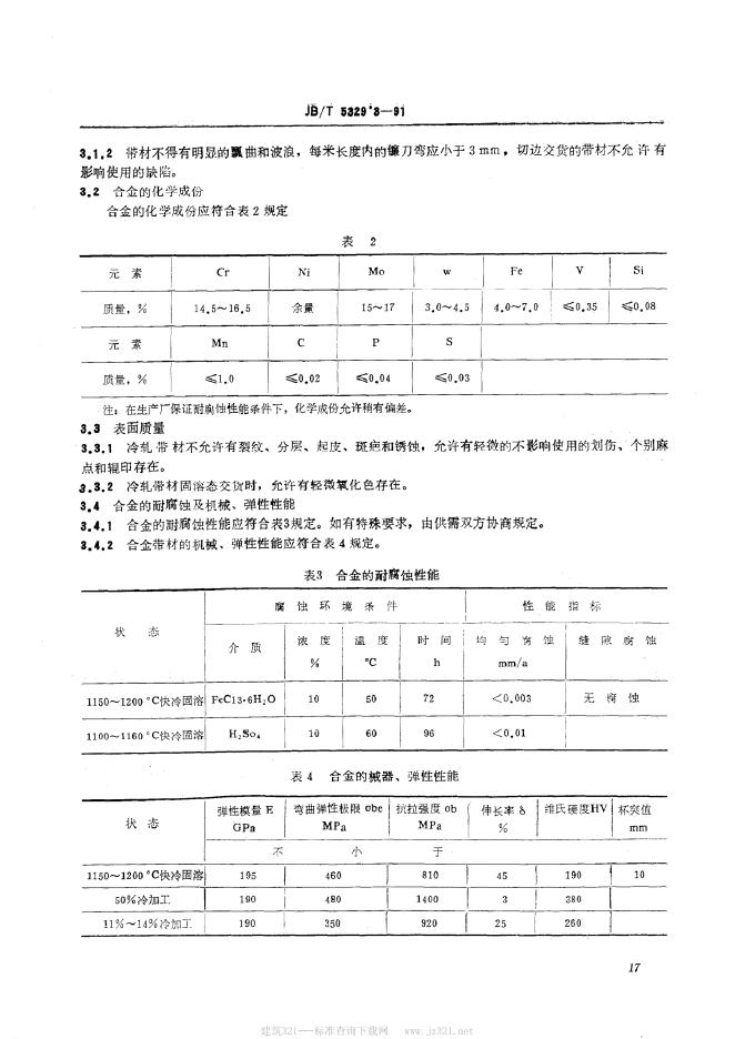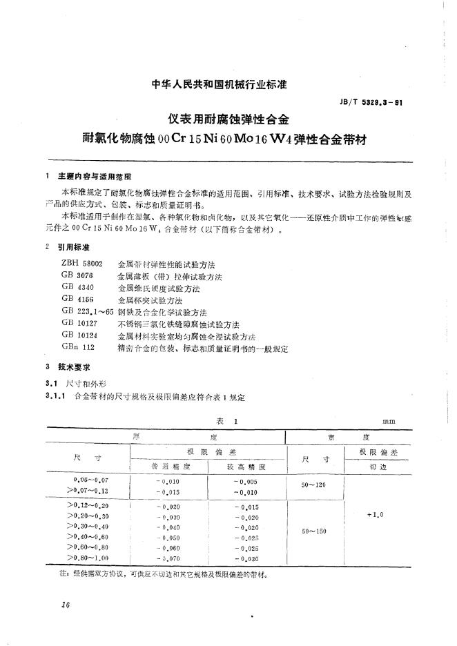JB/T 5329.3-1991 仪表用耐腐蚀弹性合金耐氯化物腐蚀 OOCr15Ni60Mo16W4弹性合金带材