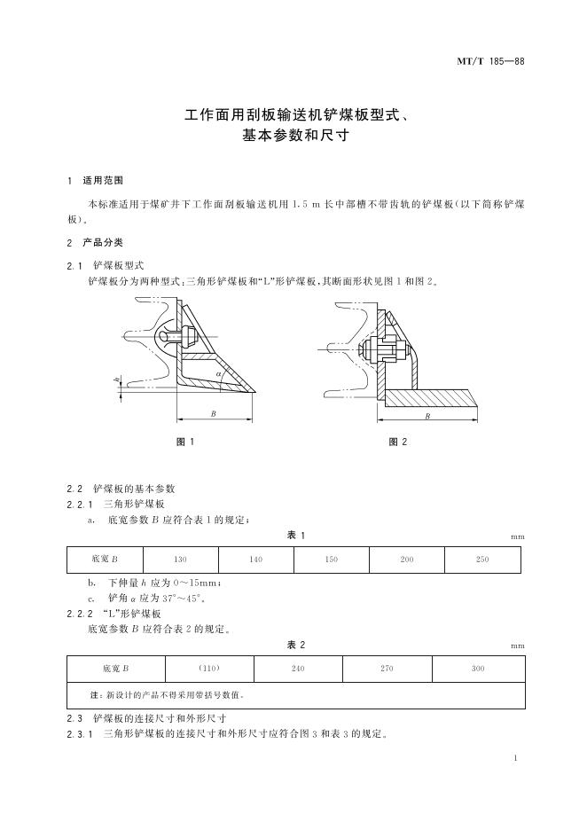 MT/T 185-1988 工作面用刮板输送机铲煤板型式、基本参数和尺寸