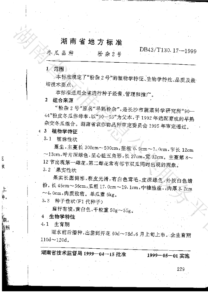 DB43/T 130.17-1999 冬瓜品种 粉杂2号