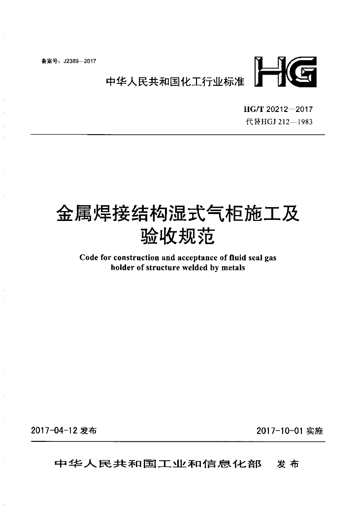 HG/T 20212-2017 金属焊接结构湿式气柜施工及验收规范
