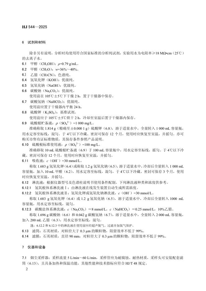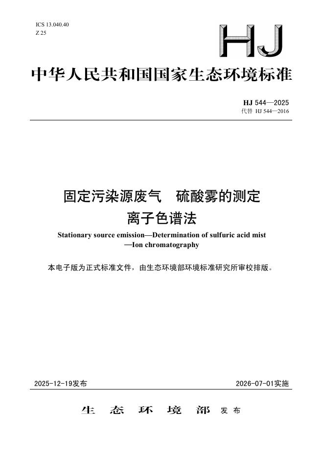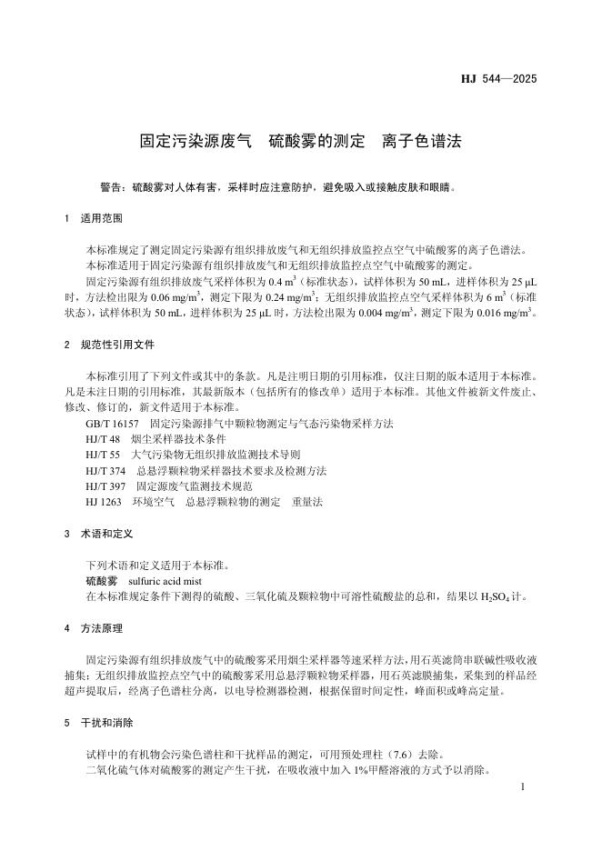 HJ 544-2025 固定污染源废气 硫酸雾的测定 离子色谱法