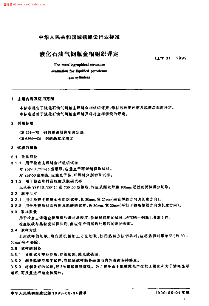 CJ/T 31-1999 液化石油气钢瓶金相组织评定规范