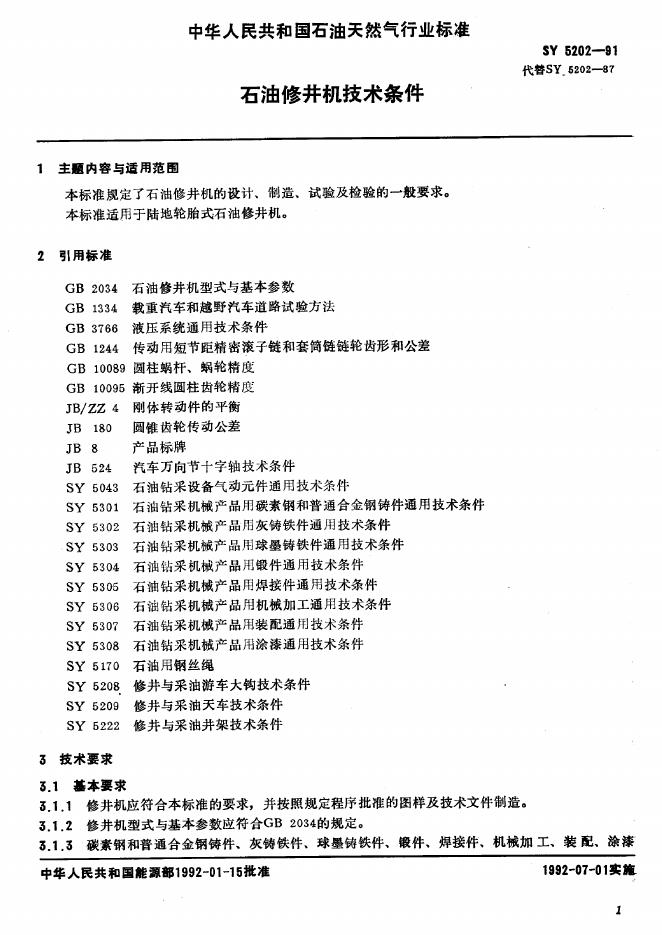 SY 5202-1991 石油修井机技术条件