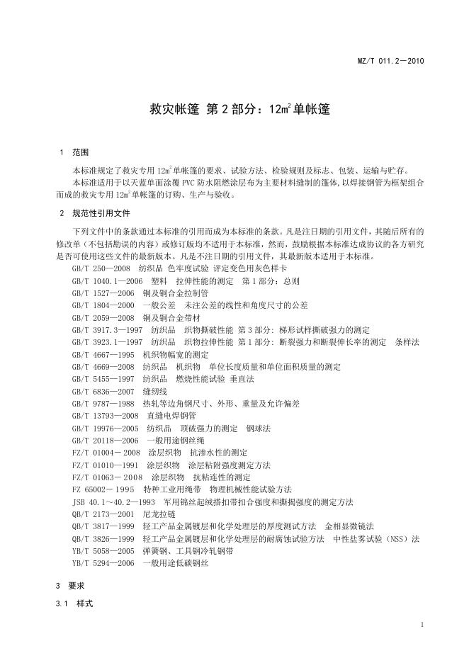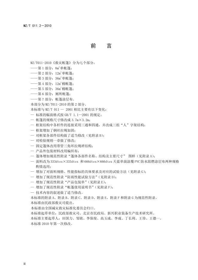 MZ/T 011.2-2010 救灾帐篷 第2部分:12㎡单帐篷