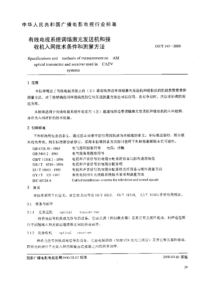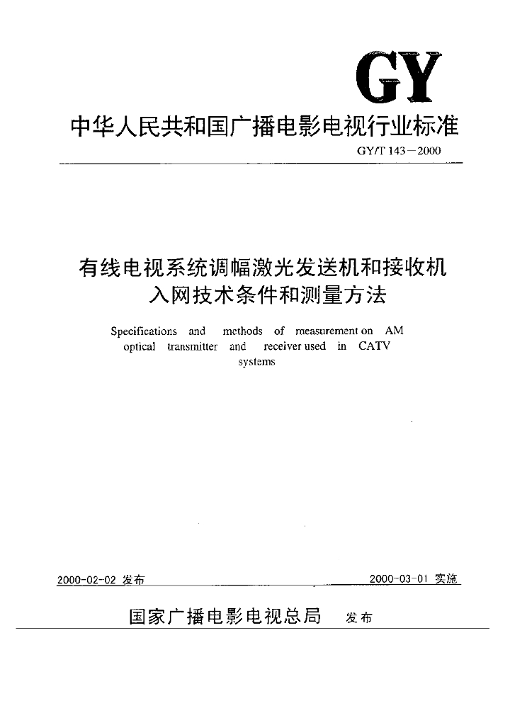 GY/T 143-2000 有线电视系统调幅激光发送机和接收机入网技术条件和测量方法