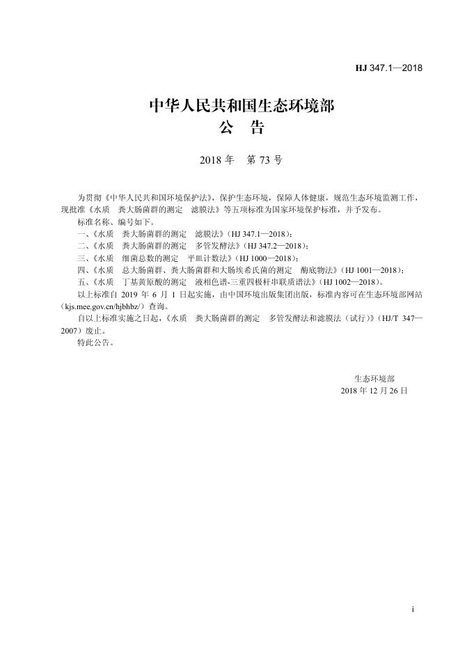 HJ 347.1-2018 水质 粪大肠菌群的测定 滤膜法