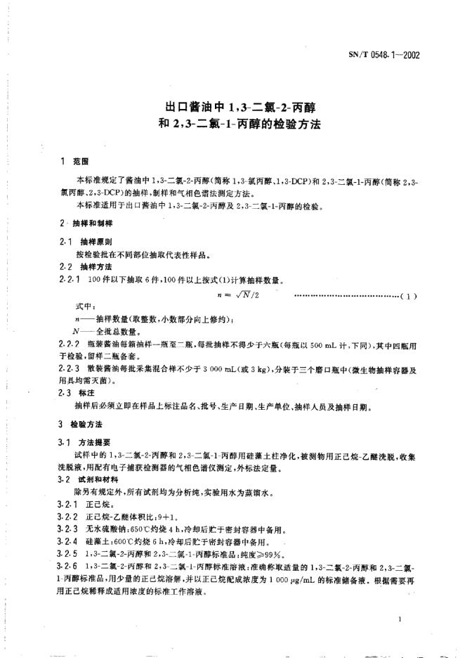 SN/T 0548.1-2002 出口酱油中1,3-二氯-2-丙醇和2,3-二氯-1-丙醇的检验方法