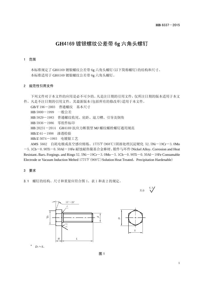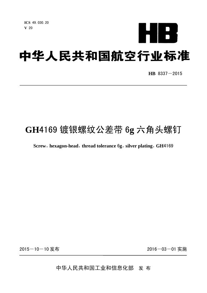 HB 8337-2015 GH4169镀银螺纹公差带6G六角头螺钉(2017)