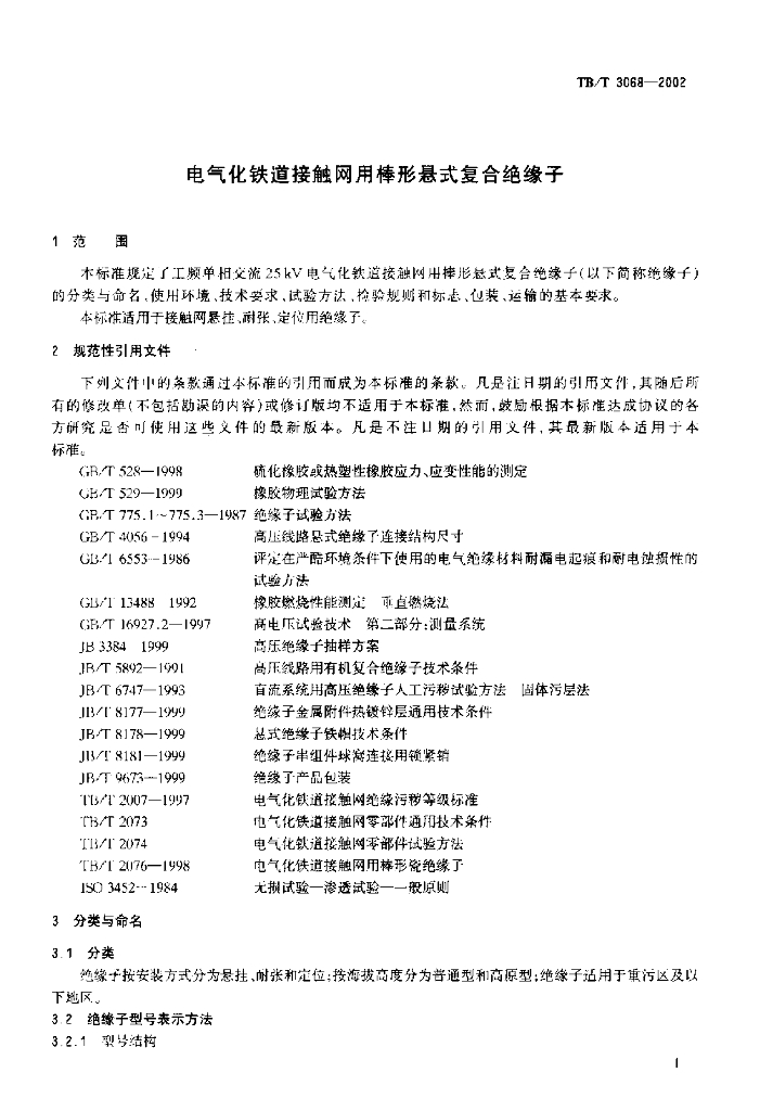 TB/T 3068-2002 电气化铁道接触网用棒形悬式复合绝缘子