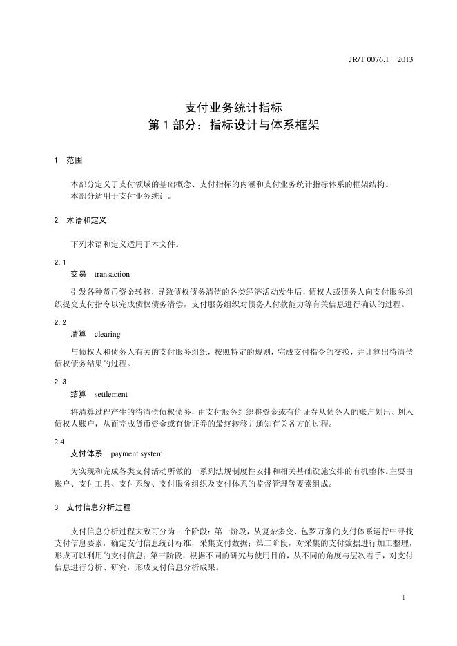 JR/T 0076.1-2013 支付业务统计指标 第1部分:指标设计与体系框架