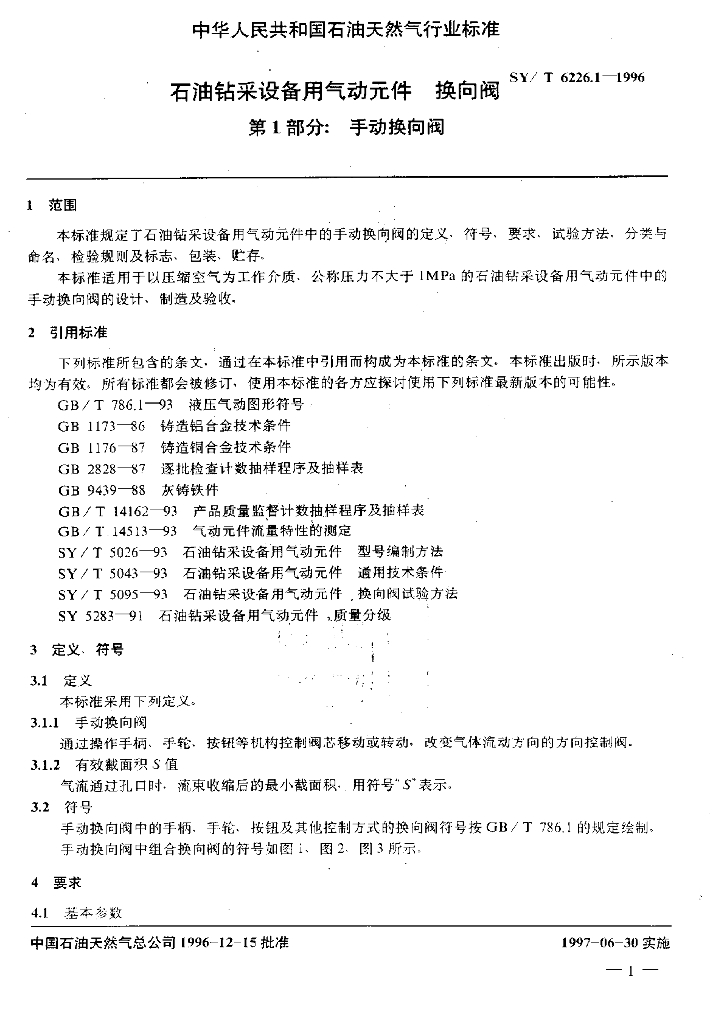 SY/T 6226.1-1996 石油钻采设备用气动元件 换向阀 第1部分:手动换向阀