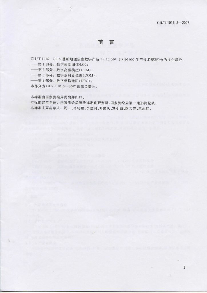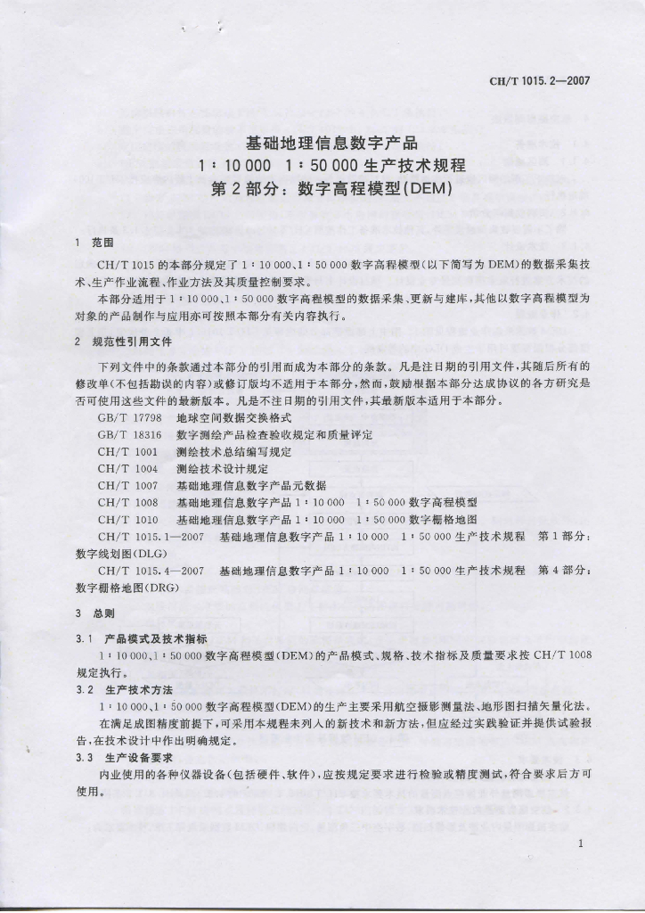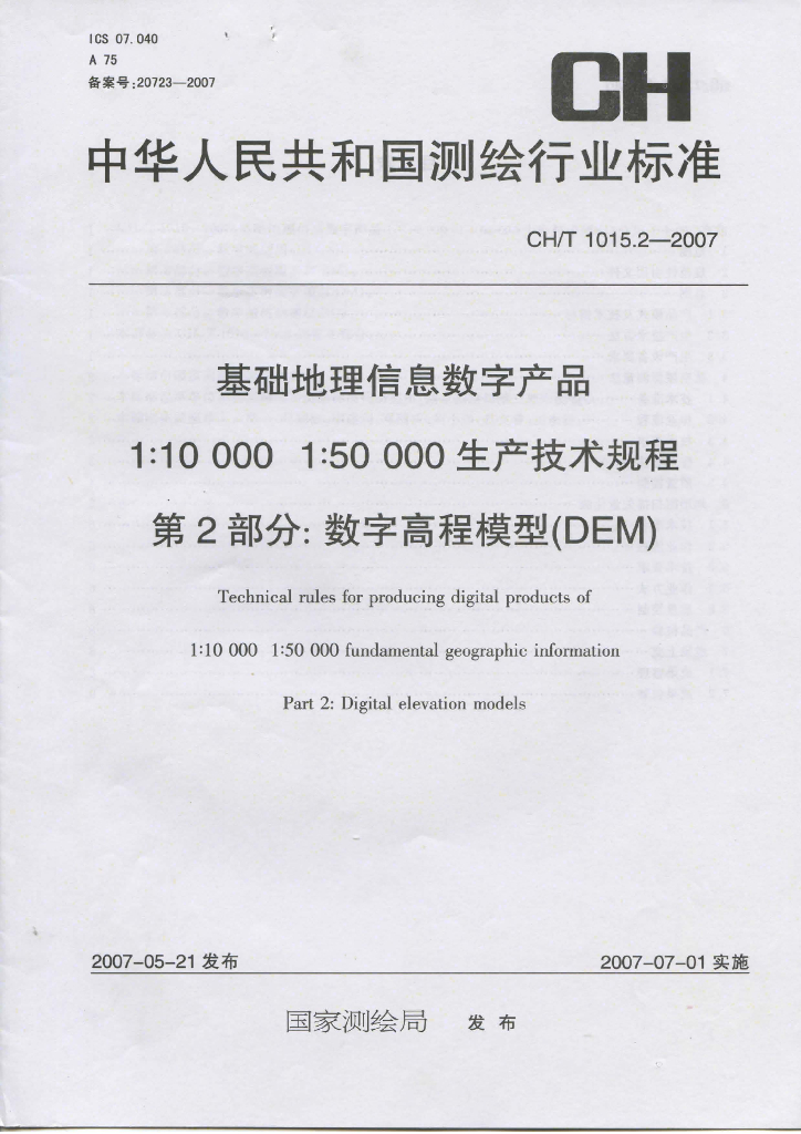 CH/T 1015.2-2007 基础地理信息数字产品1:10 000 1:50 000生产技术规程 第2部分:数字高程模型(DEM)