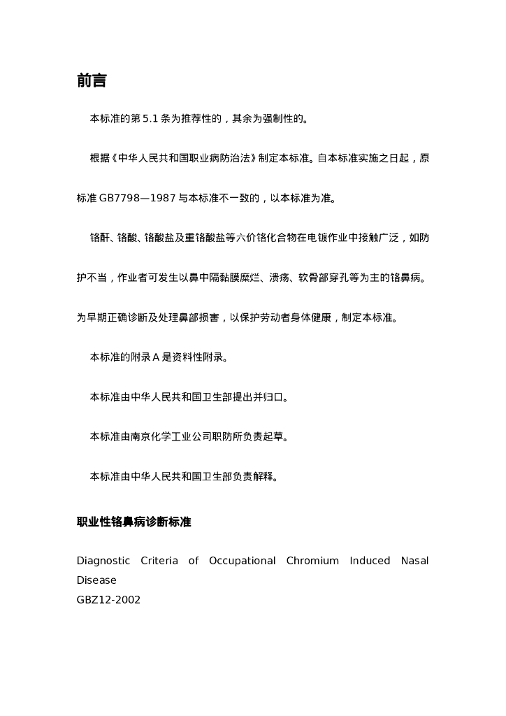 GBZ 12-2002 职业性铬鼻病诊断标准