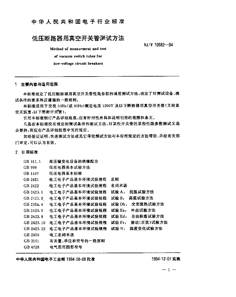 SJ/T 10582-1994 低压断路器用真空开关管测试方法