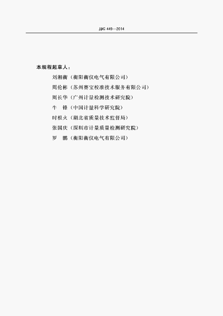刘湘衡(衡阳衡仪电气有限公司)、周伦彬(苏州赛宝校准技术服务有限公司)、周长华(广州计量检测技术研究院)、牛锋(中国计量科学研究院)、时根火(湖北省质量技术监督局)、张国庆(深圳市计量质量检测研究院)、罗鹏(衡阳衡仪电气有限公司)