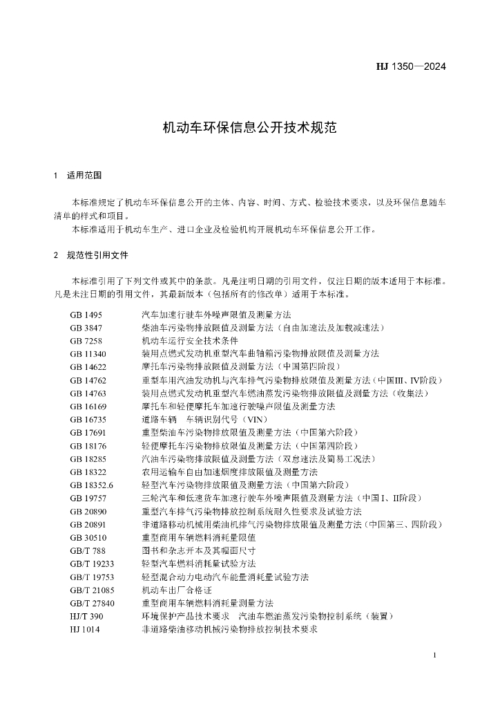 HJ 1350-2024 机动车环保信息公开技术规范