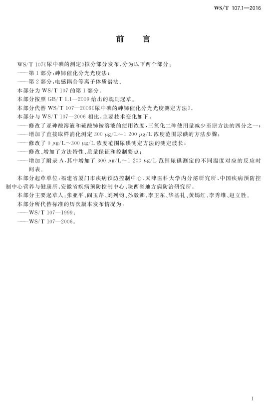 WS/T 107.1-2016 尿中碘的测定 第1部分:砷铈催化分光光度法