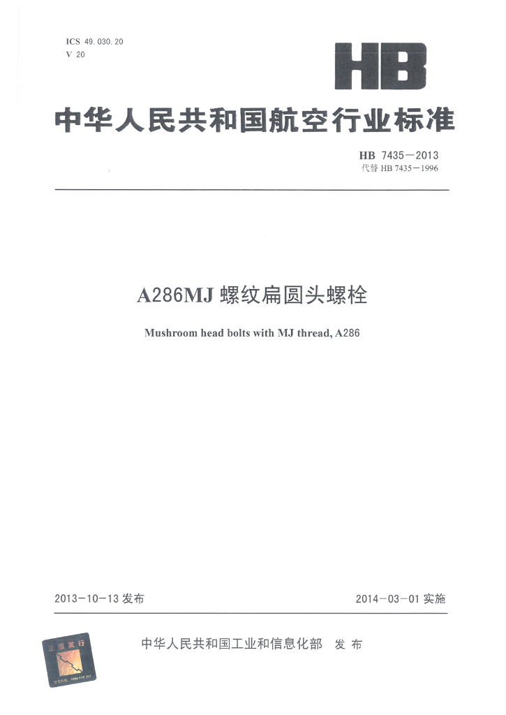 HB 7435-2013 A286MJ螺纹扁圆头螺栓