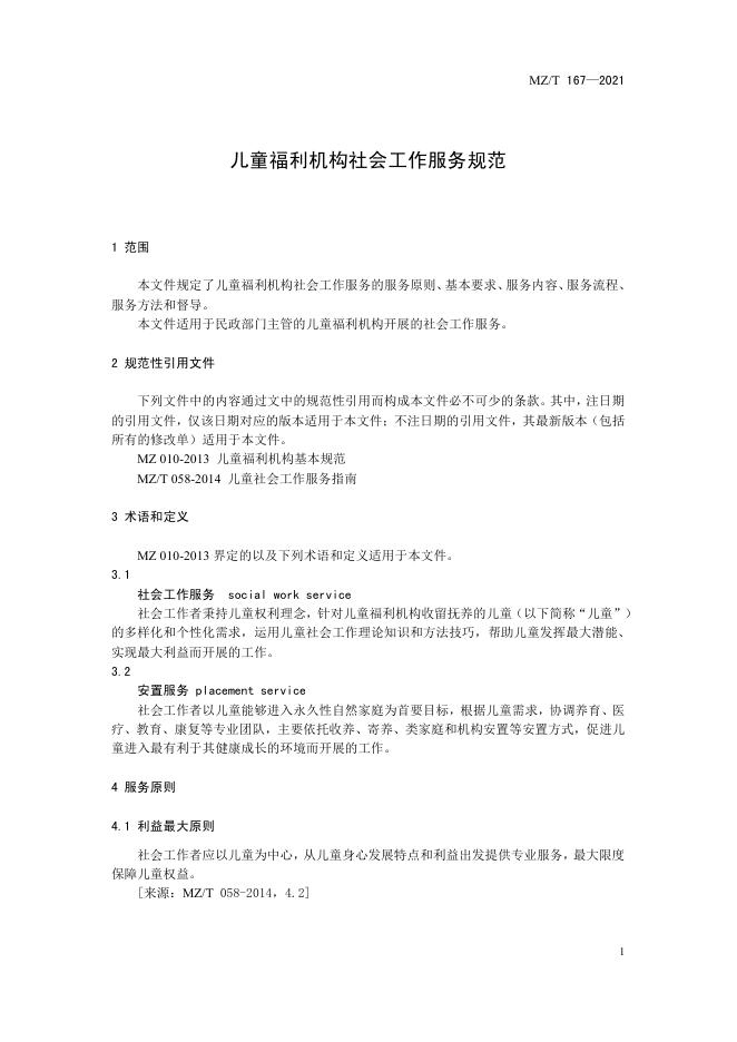MZ/T 167-2021 儿童福利机构社会工作服务规范