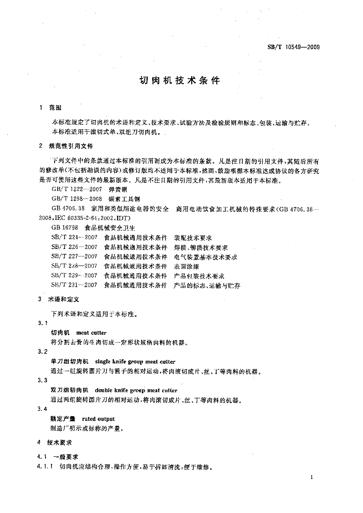 SB/T 10549-2009 切肉机技术条件