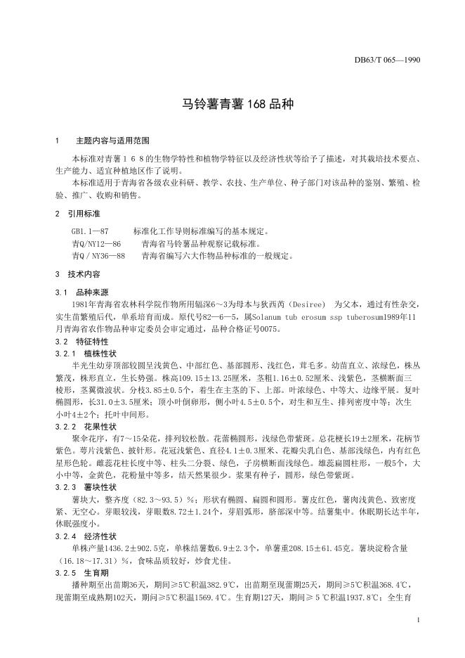 DB63/T 065-1990 马铃薯青薯168号品种