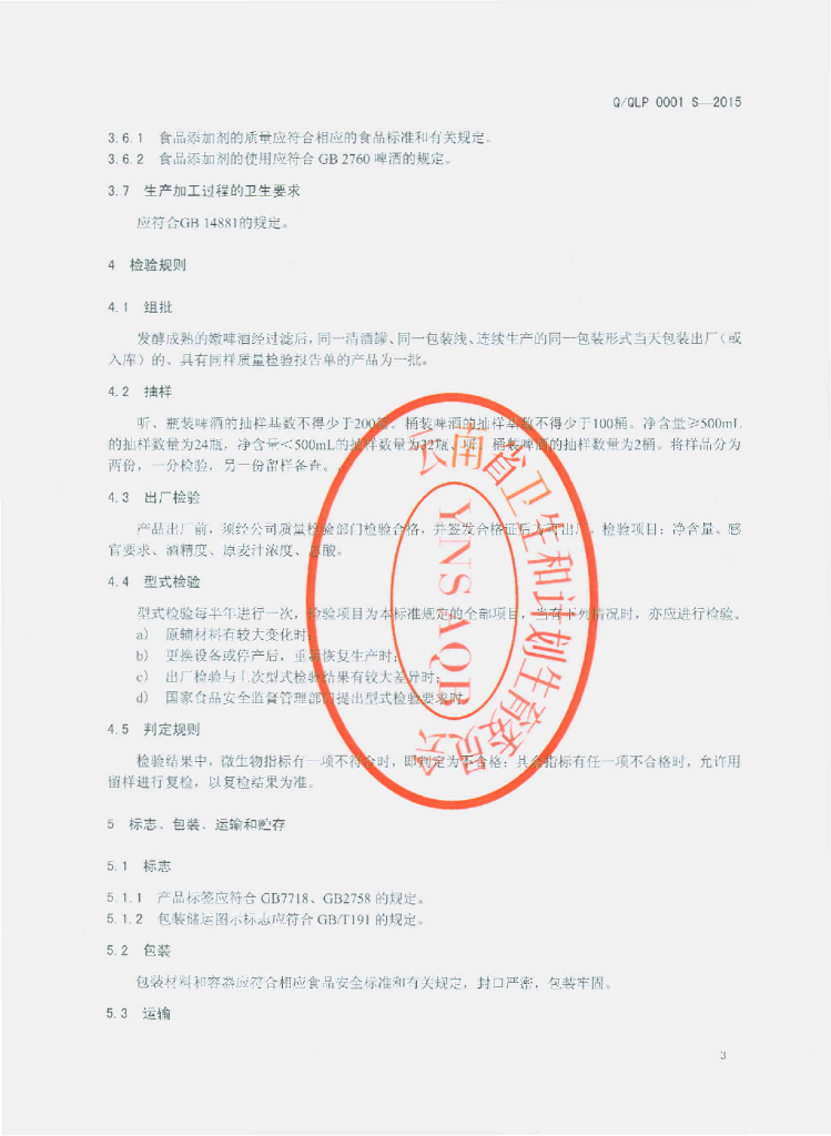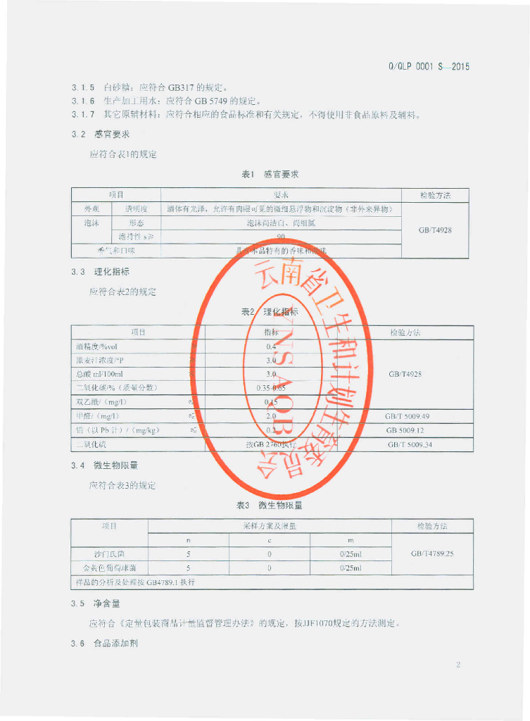 Q/QLP 0001S-2015 云南德宏泉力啤酒有限公司 果味啤酒