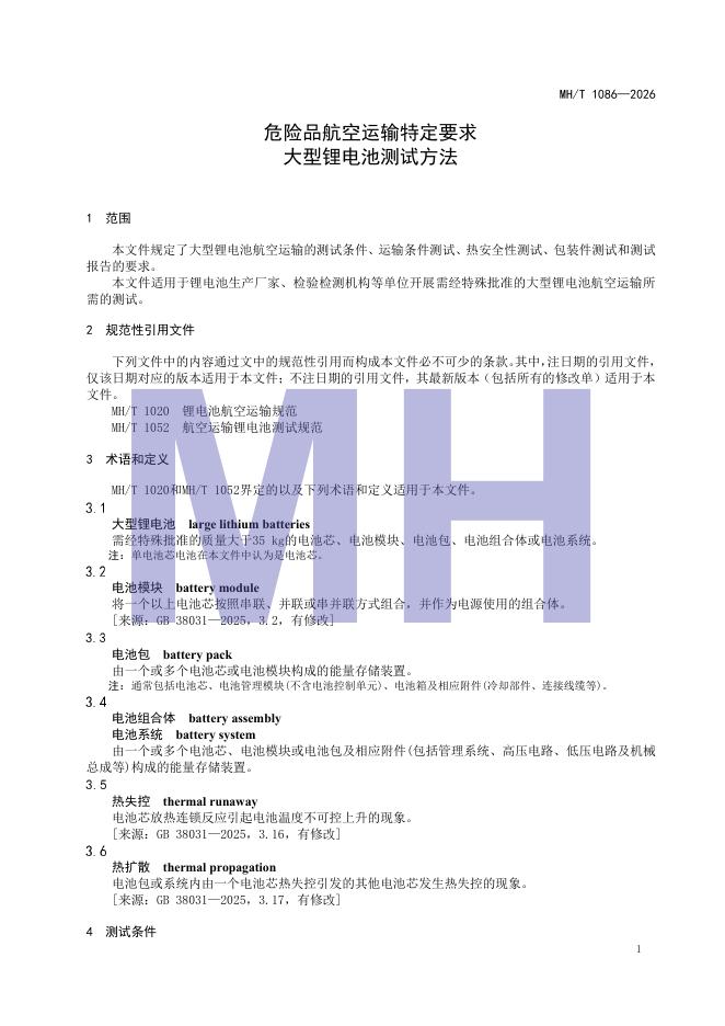 MH/T 1086-2026 危险品航空运输特定要求 大型锂电池测试方法