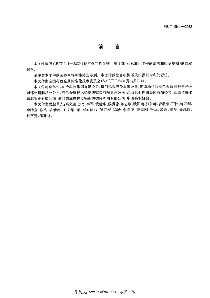 矿冶科技集团有限公司、厦门钨业股份有限公司、湖南柿竹园有色金属有限责任公司郴州钨制品分公司、有色金属技术经济研究院有限责任公司、江西钨业控股集团有限公司、江西省修水赣北钨业有限公司、荆门德威格林美钨资源循环利用有限公司、中国钨业协会