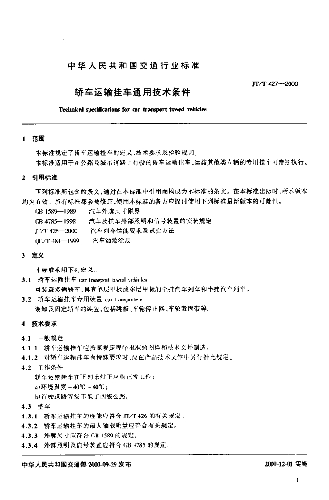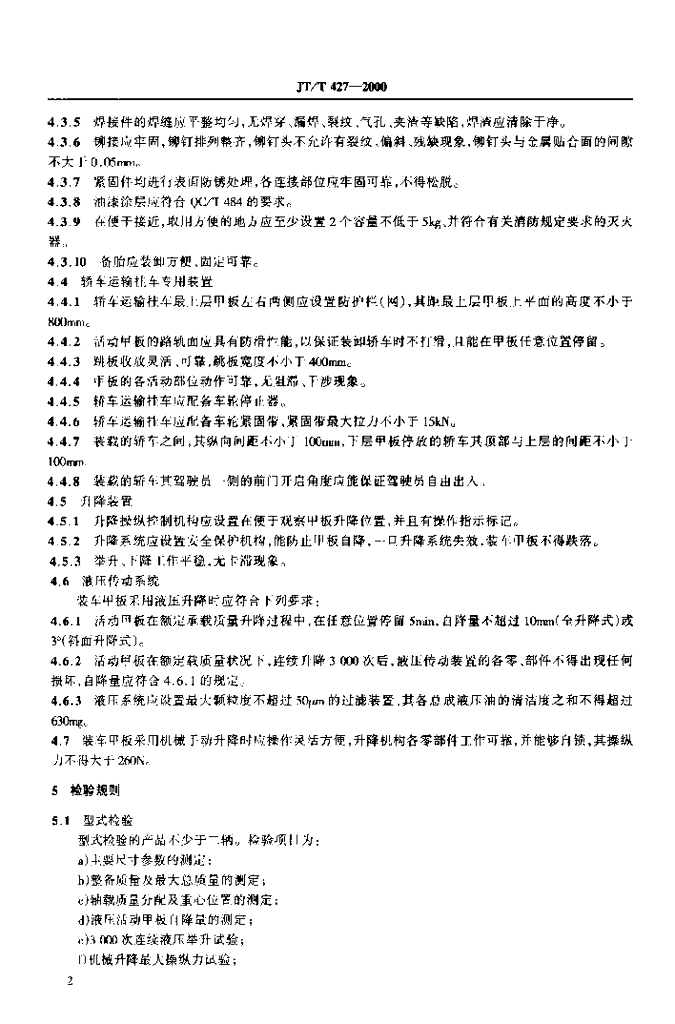 JT/T 427-2000 轿车运输挂车通用技术条件