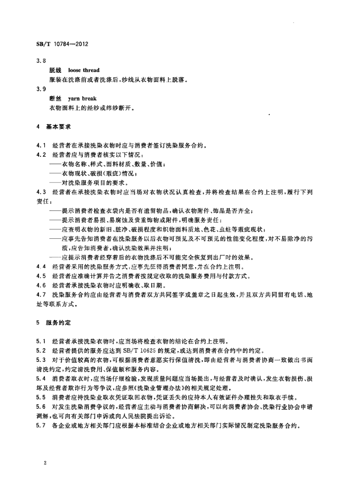 SB/T 10784-2012 洗染服务合约技术规范