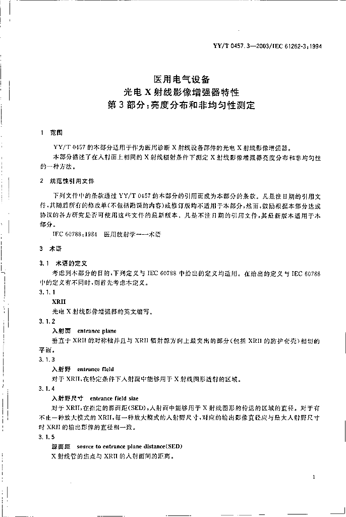 YY/T 0457.3-2003/IEC 61262-3:1994 医用电气设备光电X射线影像增强器特性 第3部分:亮度分布和非均匀性测定