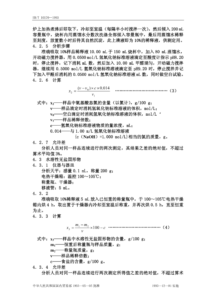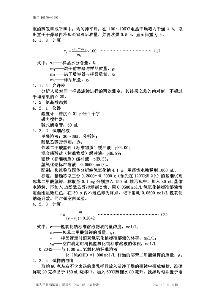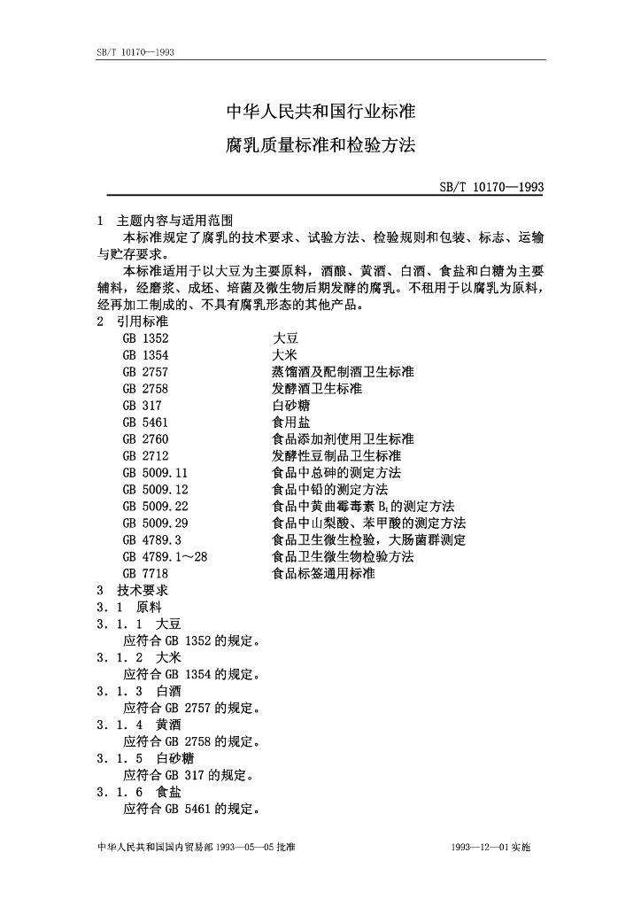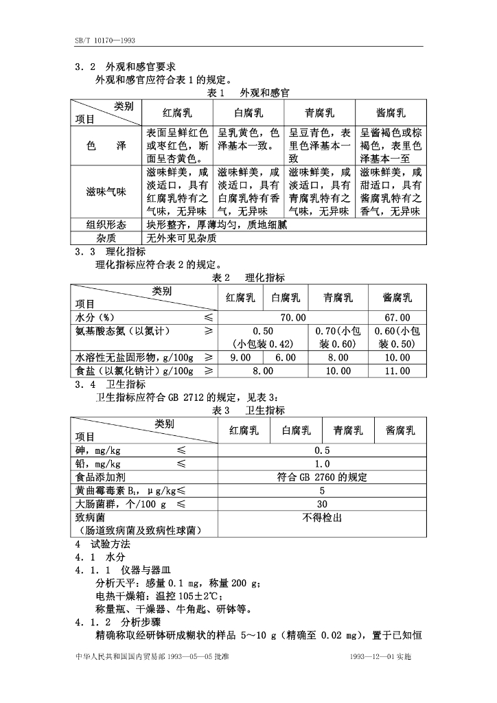 SB/T 10170-1993 腐乳质量标准和检验方法