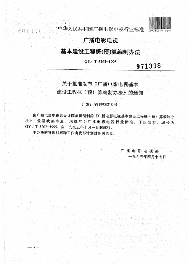 GY/ T 5202-1995 广播电影电视基本建设工程概(预)算编制办法