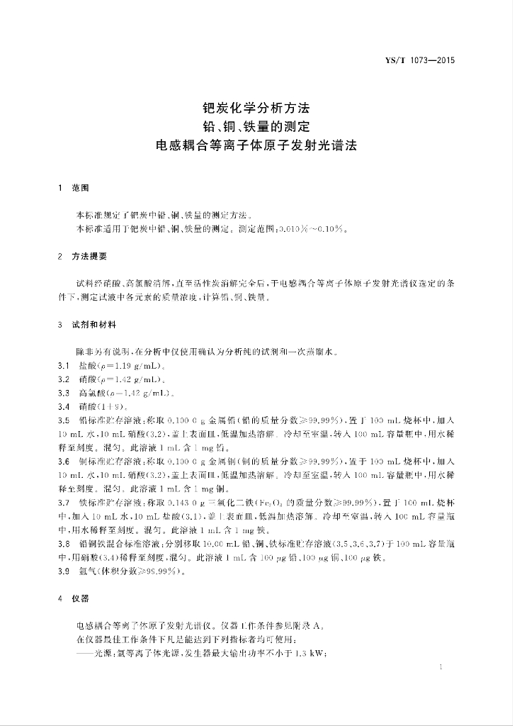 YS/T 1073-2015 钯炭化学分析方法 铅、铜、铁量的测定 电感耦合等离子体原子发射光谱法